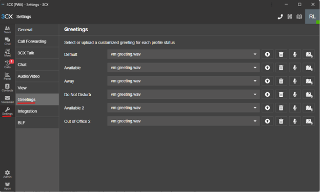 - On your 3CX web browser version (https://3cx.powerstonepm.com:5001/), go to Settings > Greetings